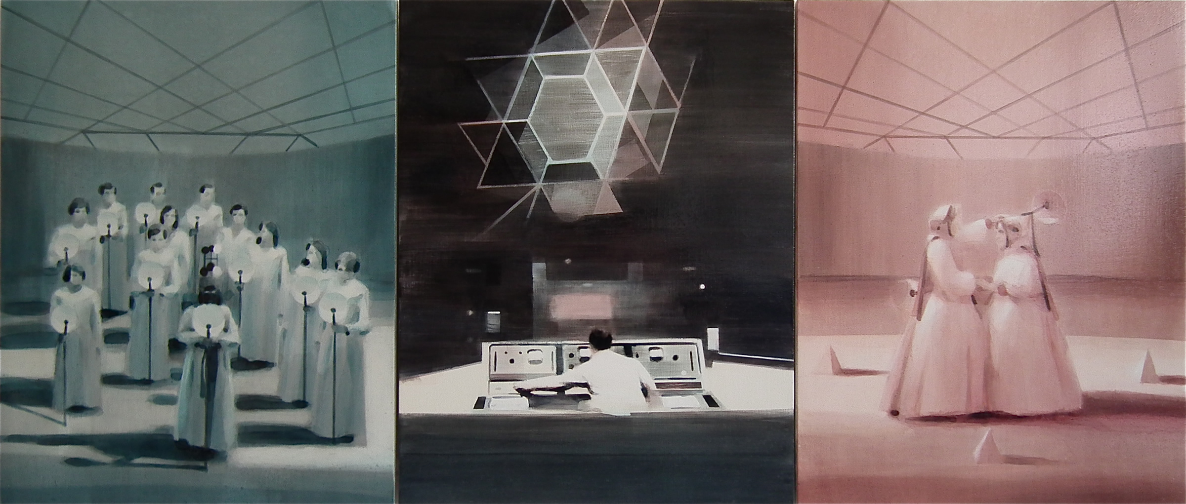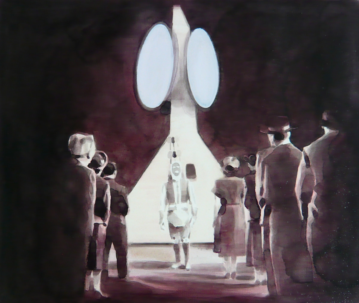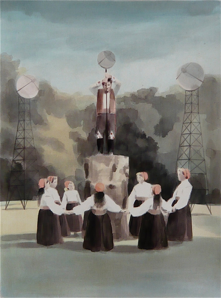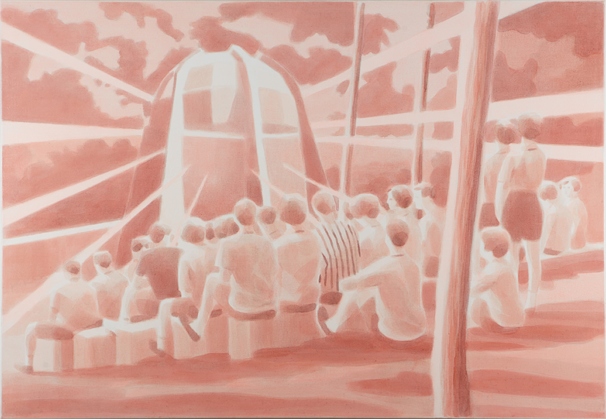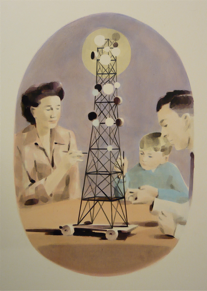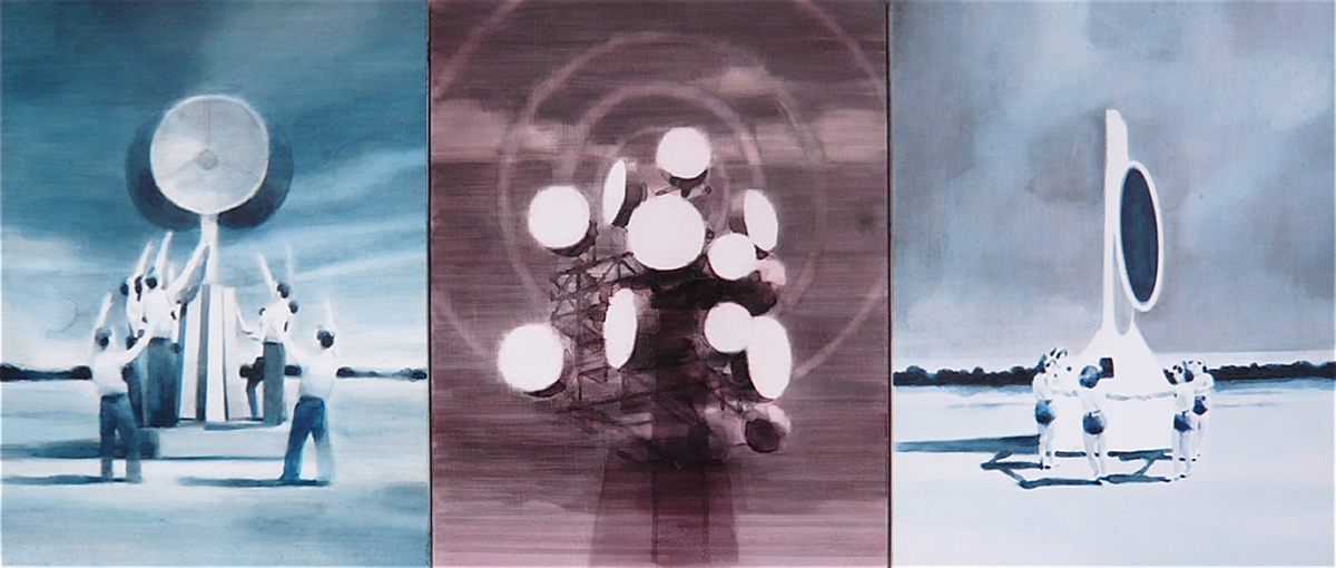 Dix’ palette of muted colours, hazy imagery and subject, anchor the work in a time of historical optimism. Referring to the imagined futures of our predecessors his deployment of colour links the subject of contemporary technology to its 1950s origins. This has led to the production of work that invites the viewer to engage in a secular celebration, whilst questioning past and present forms of ‘social networking’ within community and the common ground that may exist between them and their effect on society.