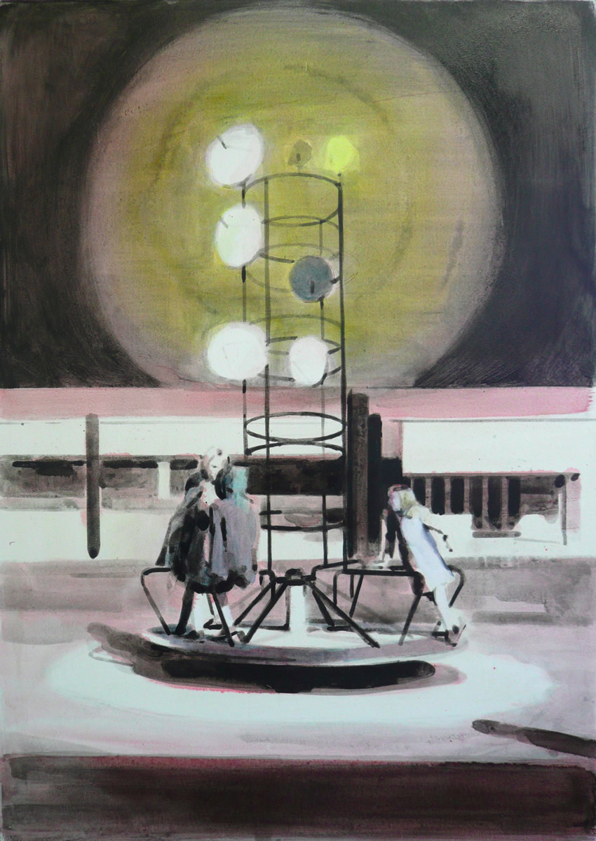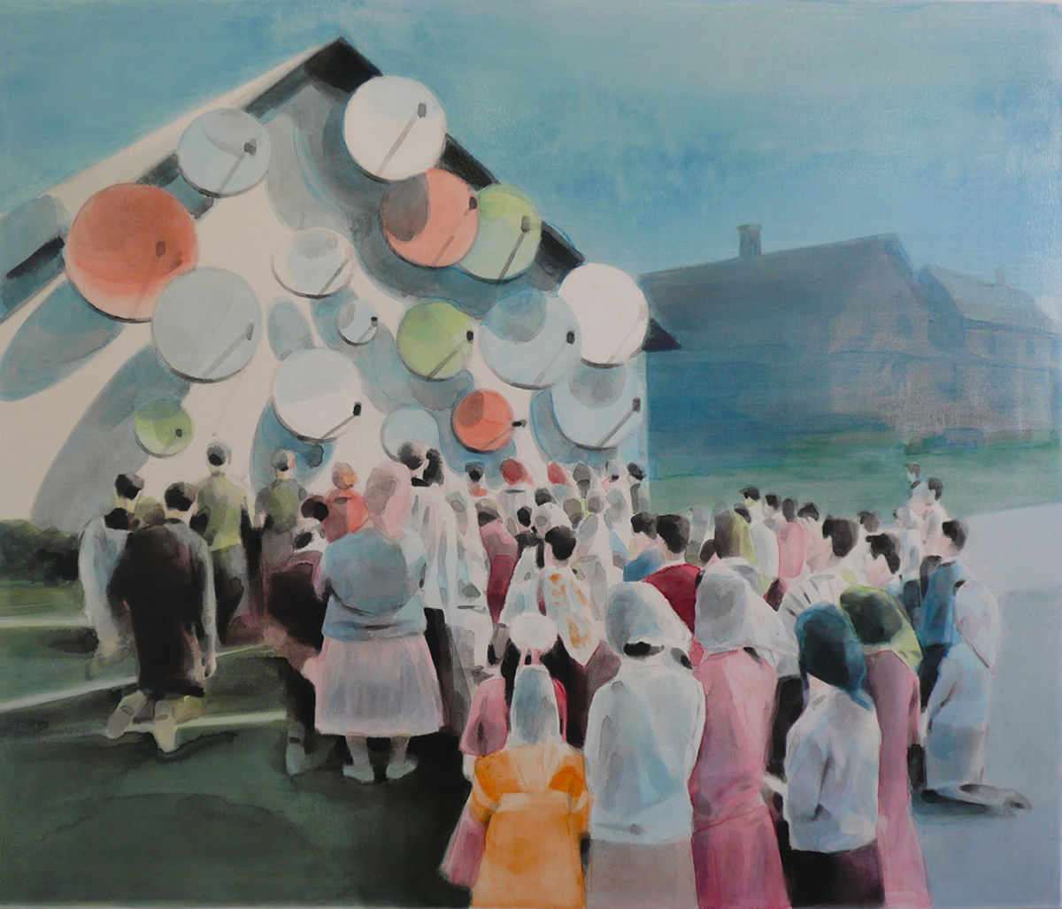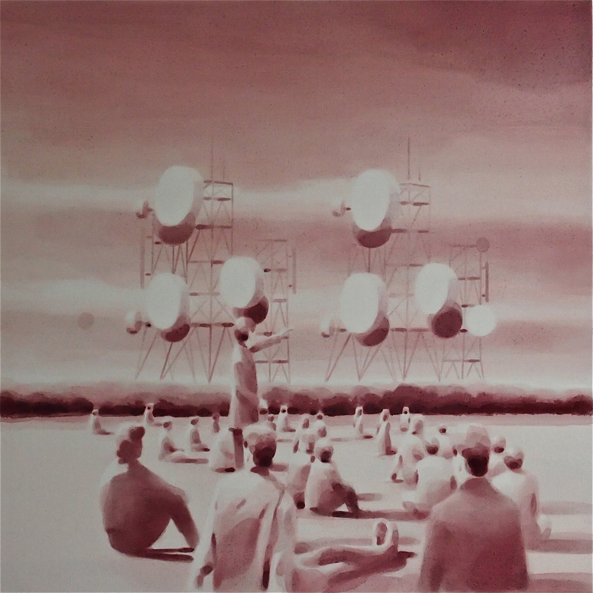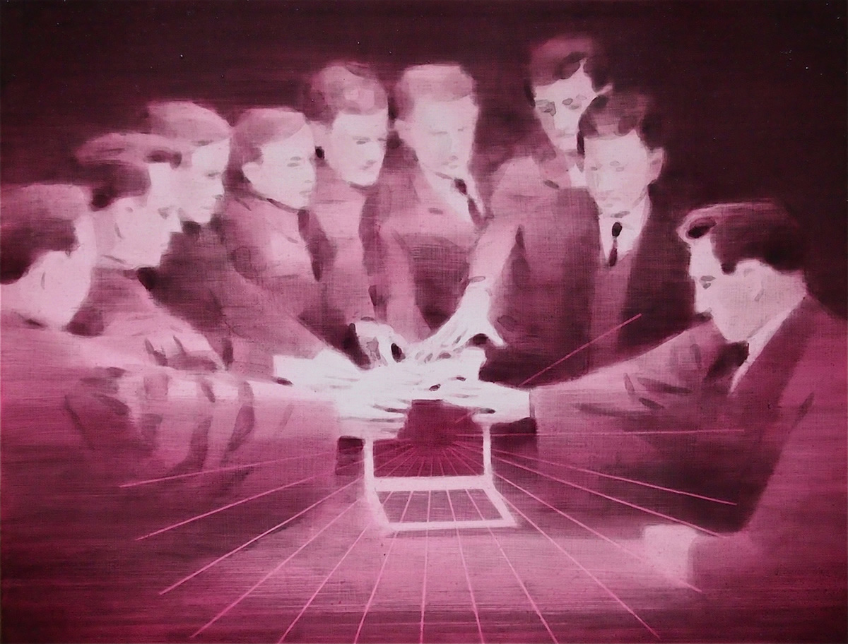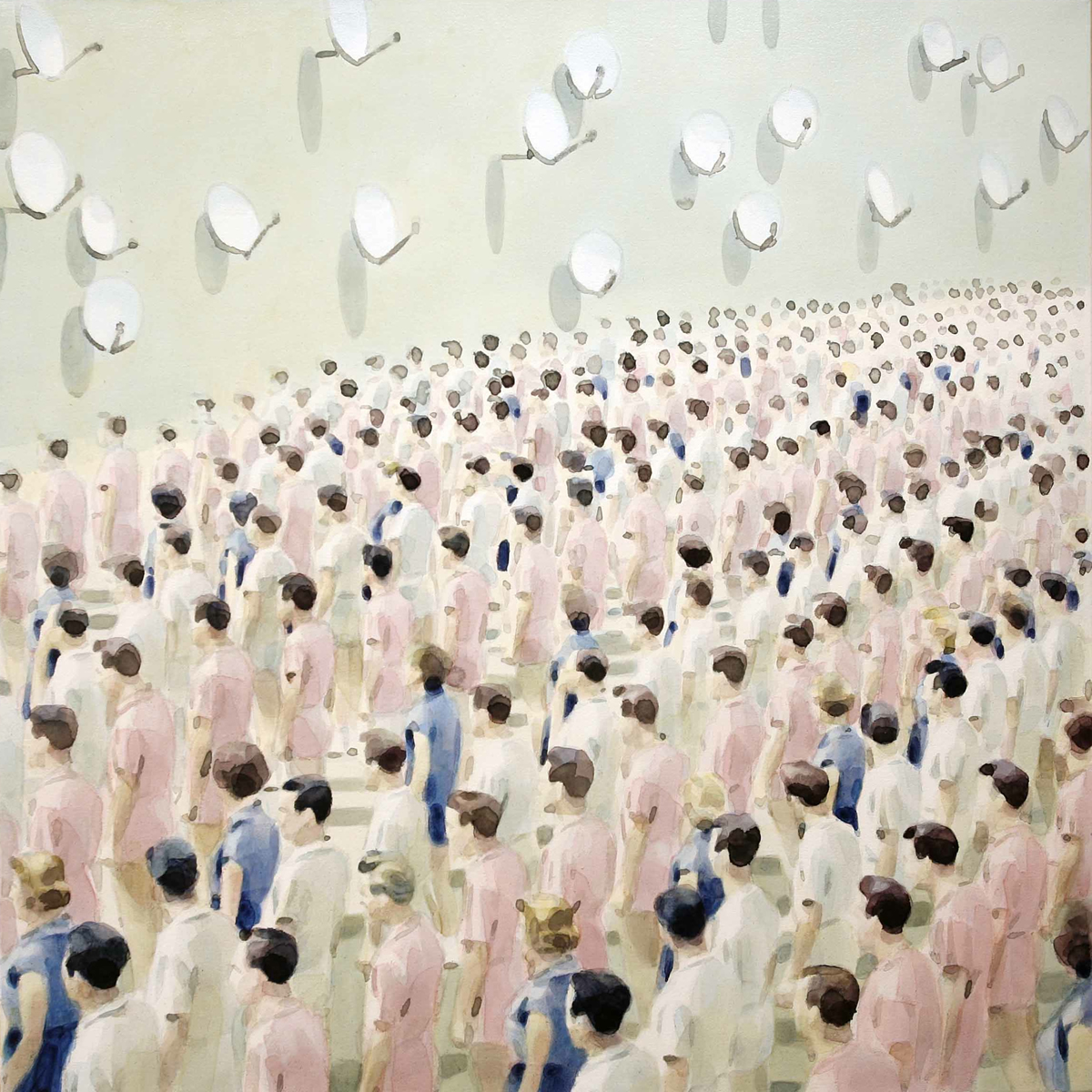 Dix’ palette of muted colours, hazy imagery and subject, anchor the work in a time of historical optimism. Referring to the imagined futures of our predecessors his deployment of colour links the subject of contemporary technology to its 1950s origins. This has led to the production of work that invites the viewer to engage in a secular celebration, whilst questioning past and present forms of ‘social networking’ within community and the common ground that may exist between them and their effect on society.